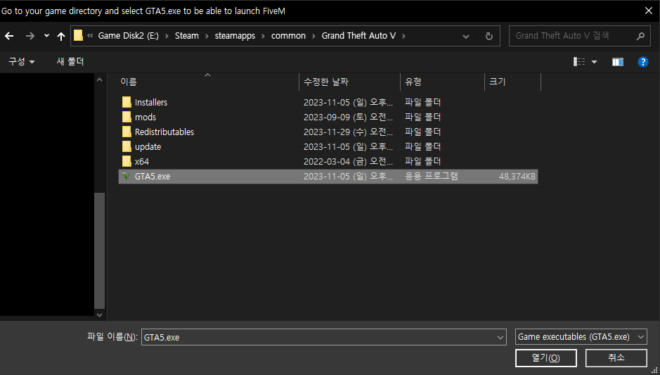4. GTA5가 설치된 경로를 들어가 GTA5.exe를 선택해주세요.