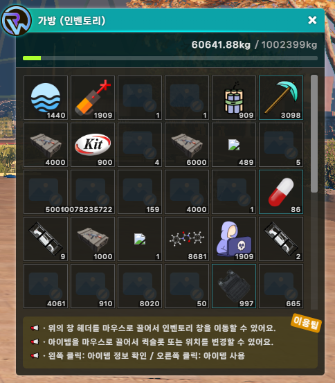 원하는 물건을 오른쪽 클릭하여 사용 또는 버릴 수 있습니다.